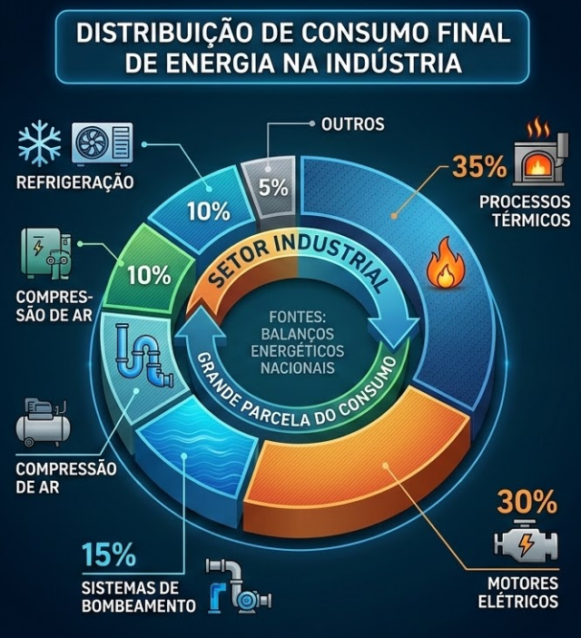 Energeticamente, concentra grande parcela do consumo final e de eletricidade, com processos térmicos, motores, bombeamento, compressão e refrigeração como principais usos. Historicamente, priorizou confiabilidade sobre otimização fina. Com PIB crescendo 2–2,4% ao ano até 2027, a eficiência é essencial para competitividade, reduzindo intensidade energética e atendendo tarifas pressionadas.